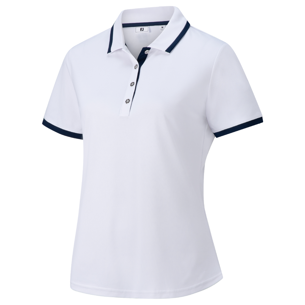The FootJoy Ladies Pique Trim Polo - White/Navy combines classic golf style with performance-driven comfort, making it perfect for the course or casual wear. Featuring clean contrast trim in a crisp white and navy colourway, this polo offers a polished, athletic look that complements a variety of golf outfits.