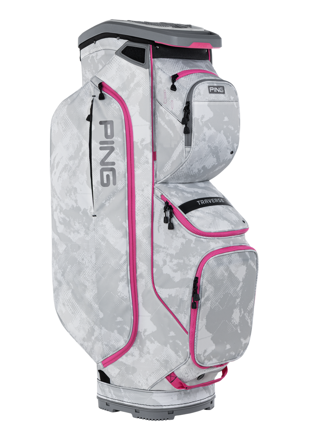 The PING Traverse Cart Bag in Platinum Graffiti/Malibu Rose blends statement-making design with practical performance. Weighing just 5.5 lbs, it’s one of the lightest full-featured cart bags available — ideal for golfers who want premium functionality without the bulk. With 11 total pockets, including two handy magnetic slip pockets, a velour-lined valuables pocket, and an insulated cooler pocket, every item has its place. The padded 14-way top with dual putter wells keeps your set neatly organised, while the fresh graffiti print and rose accents bring a fun, fashionable edge to your game.